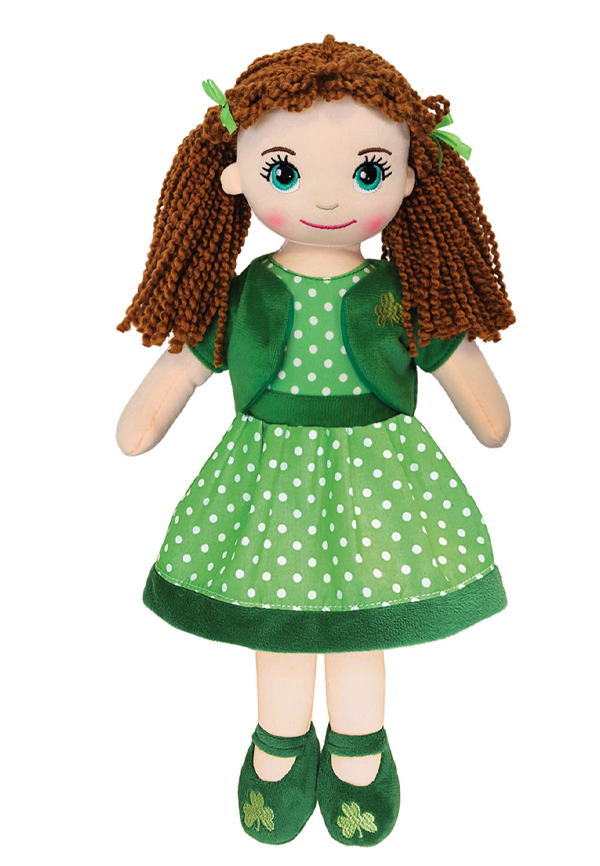 Standing at 42cm tall, this girl rag doll is dressed in a charming ensemble, featuring a dress with a velour jacket and shoes. Her wool hair is adorned with ribbons.
