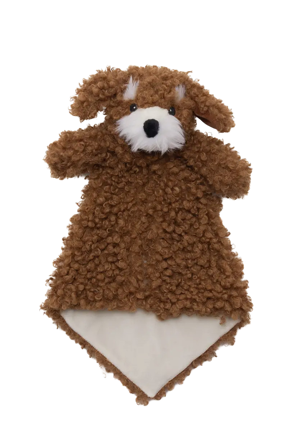 Muggle Buggle has a fluffy curly brown body with a beige belly, black eyes and a black nose.